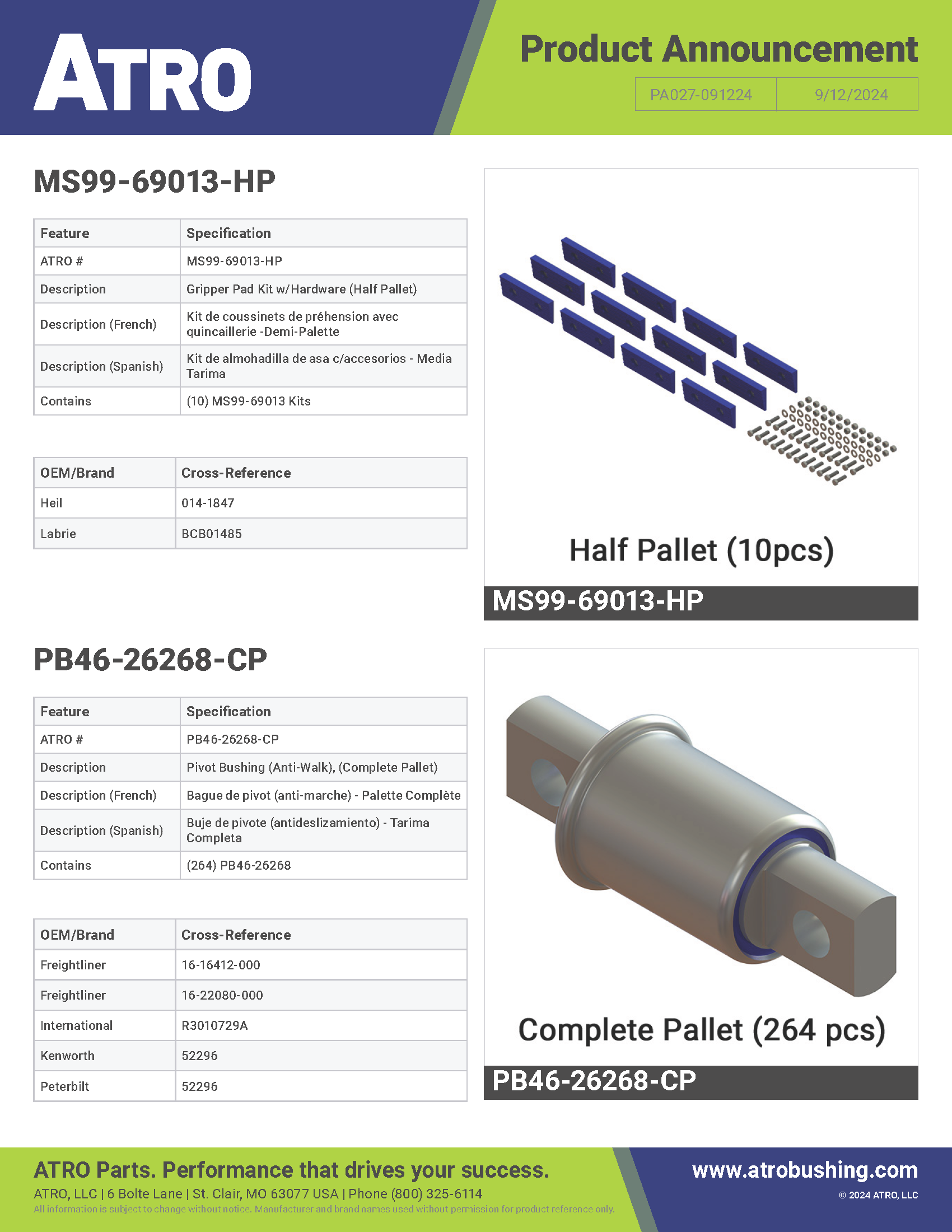 ATRO polyurethane parts last longer and are 3-5 stronger than rubber, meaning fewer replacements, less frequent downtime, and a significant reduction in the risk of system-wide damage. ATRO parts are specially designed to provide superior durability and reliability, protecting not just the part itself, but the entire suspension system. This translates to better performance on the road and less strain on the truck, improving overall reliability, and reducing total lifecycle costs.
